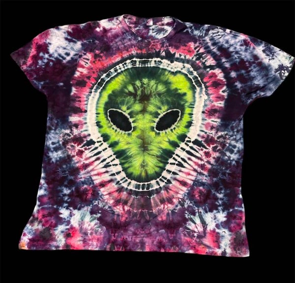 Peace out with these one of a kind tees featuring an Alien. Tie Dye Adult T-shirt comes in size Small, Medium, Large, XLarge, 2XL, 3XL. Hand dyed shirts are similar but differ slightly from each other. Fiber reactive dye on 100% cotton Gildan brand shirts.