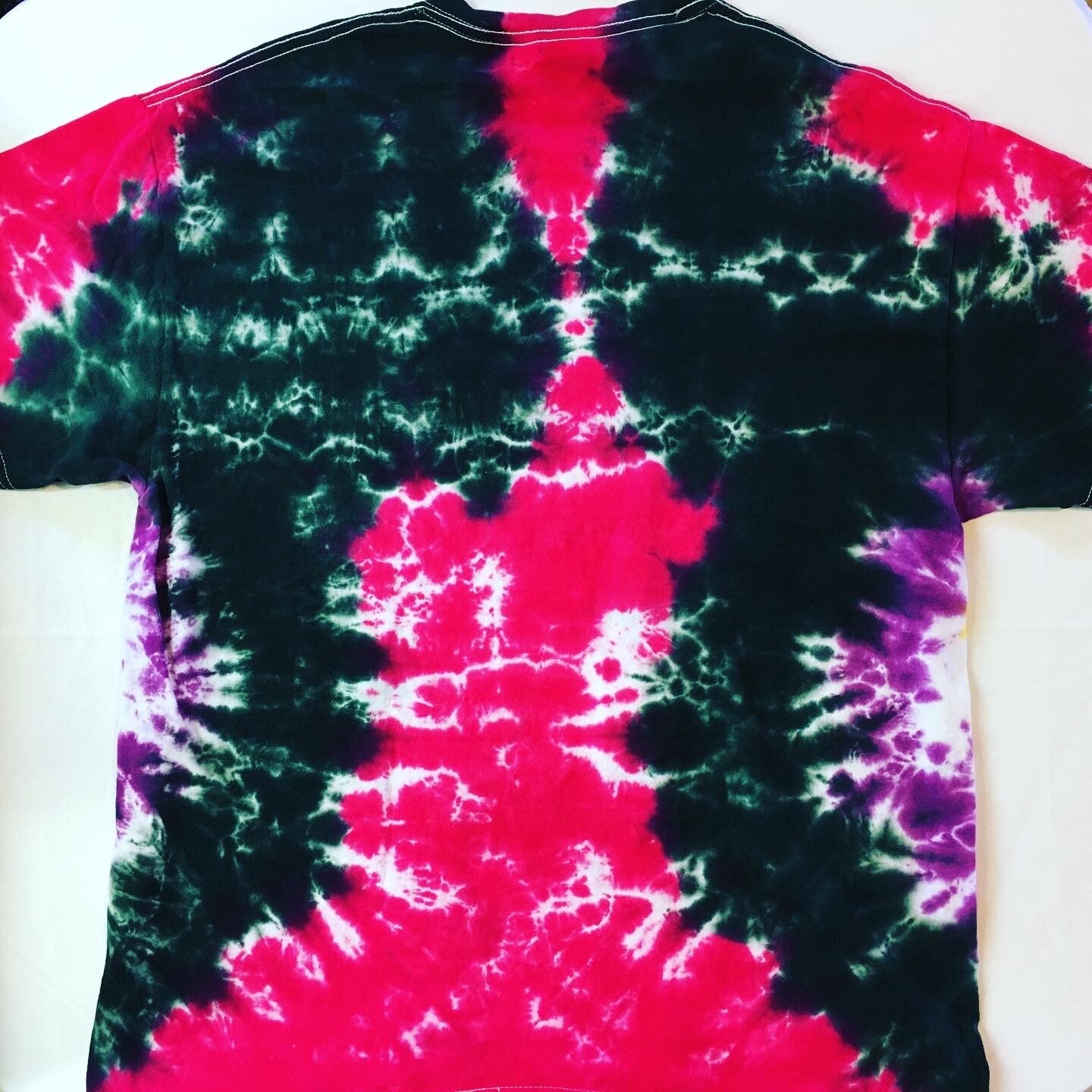 You will get the exact shirt pictured in the photo. Peace out with these one of a kind tees. Tie Dye Adult T-shirt in size X Large. Comes in various colors and designs to choose from. Fiber reactive dye on 100% cotton Gildan brand shirts.