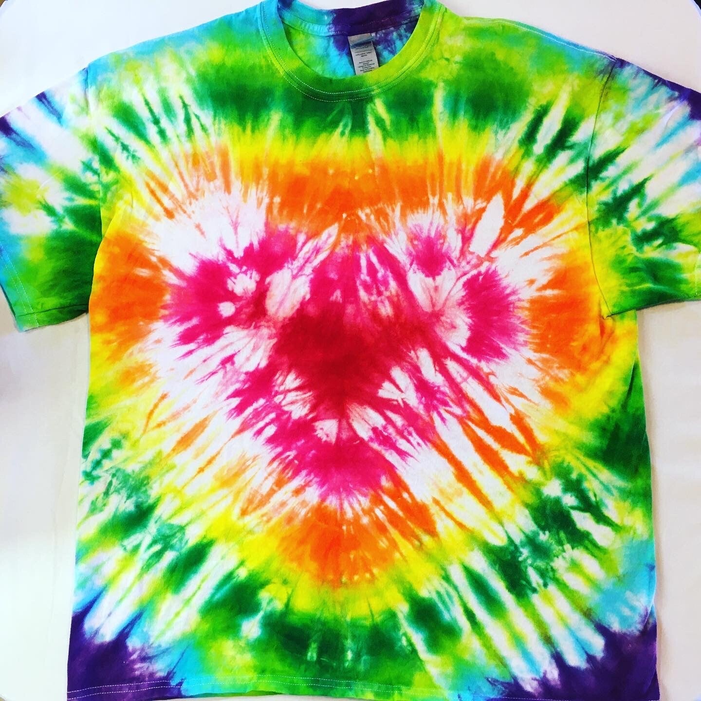 You will get the exact shirt pictured in the photo. Peace out with these one of a kind tees. Tie Dye Adult T-shirt in size XLarge. Comes in various colors and designs to choose from. Fiber reactive dye on 100% cotton Gildan brand shirts.