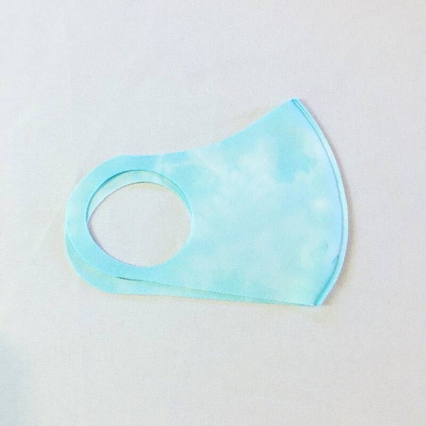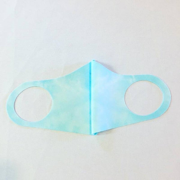 Peace out with these one of a kind Elsa ice blue tie dye face masks. Each mask is made from stretchy spandex and fiber reactive dye. Machine washable. Adult size fits most faces. Mask measures approximately 12 inches from ear to ear and approximately 5 inches from nose to chin. Comes in an ice blue marbled color. Soft loops fit comfortably over the ears. Has no filter pocket or bendy nose wire