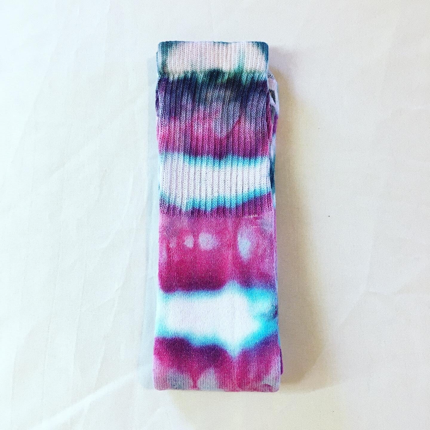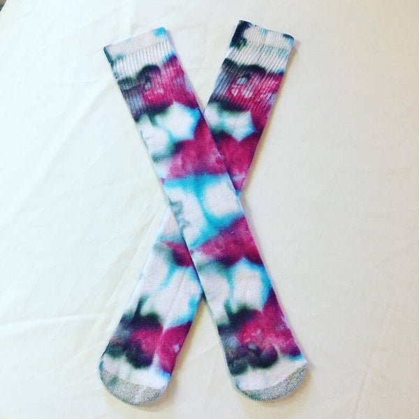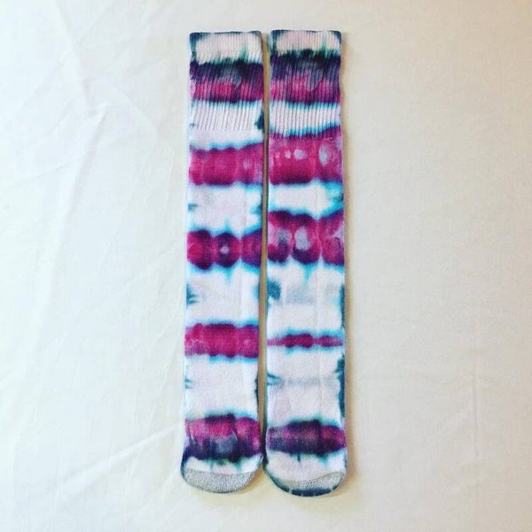 Peace out with these one of a kind knee high socks. You get one awesome pair of socks in a unique ice dye pattern. Socks fits unisex size 6-12US.