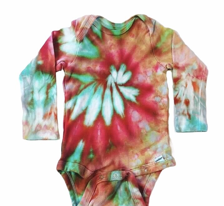 You will get the exact shirt pictured in the photo. Peace out with these one of a kind tees. Tie Dye baby onesie shirt in size 24 months. Comes in various colors and designs to choose from. Fiber reactive dye on 100% cotton Gerber brand organic baby onesie.