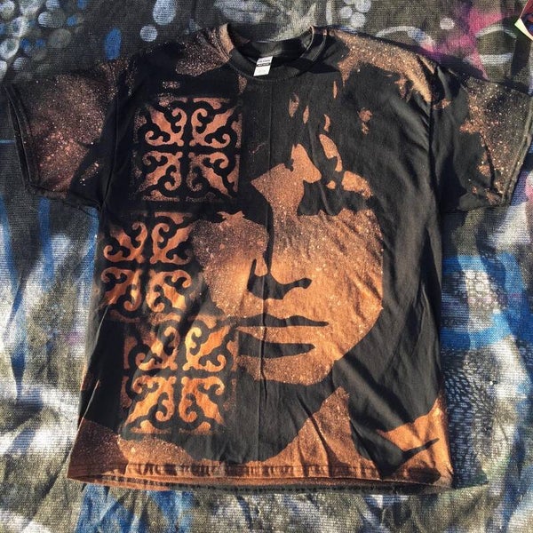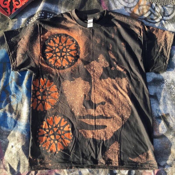 Bleach spray black T-Shirt comes in sizes Adult Small, Medium, Large and Extra Large and is made with a custom image of Jim Morrison and various other designs of either Hearts or Fancy Fillagry of your choice. Each shirt is machine washable, made of 100% cotton. Please be aware that every shirt is unique and no two shirts will ever come out looking exactly the same.