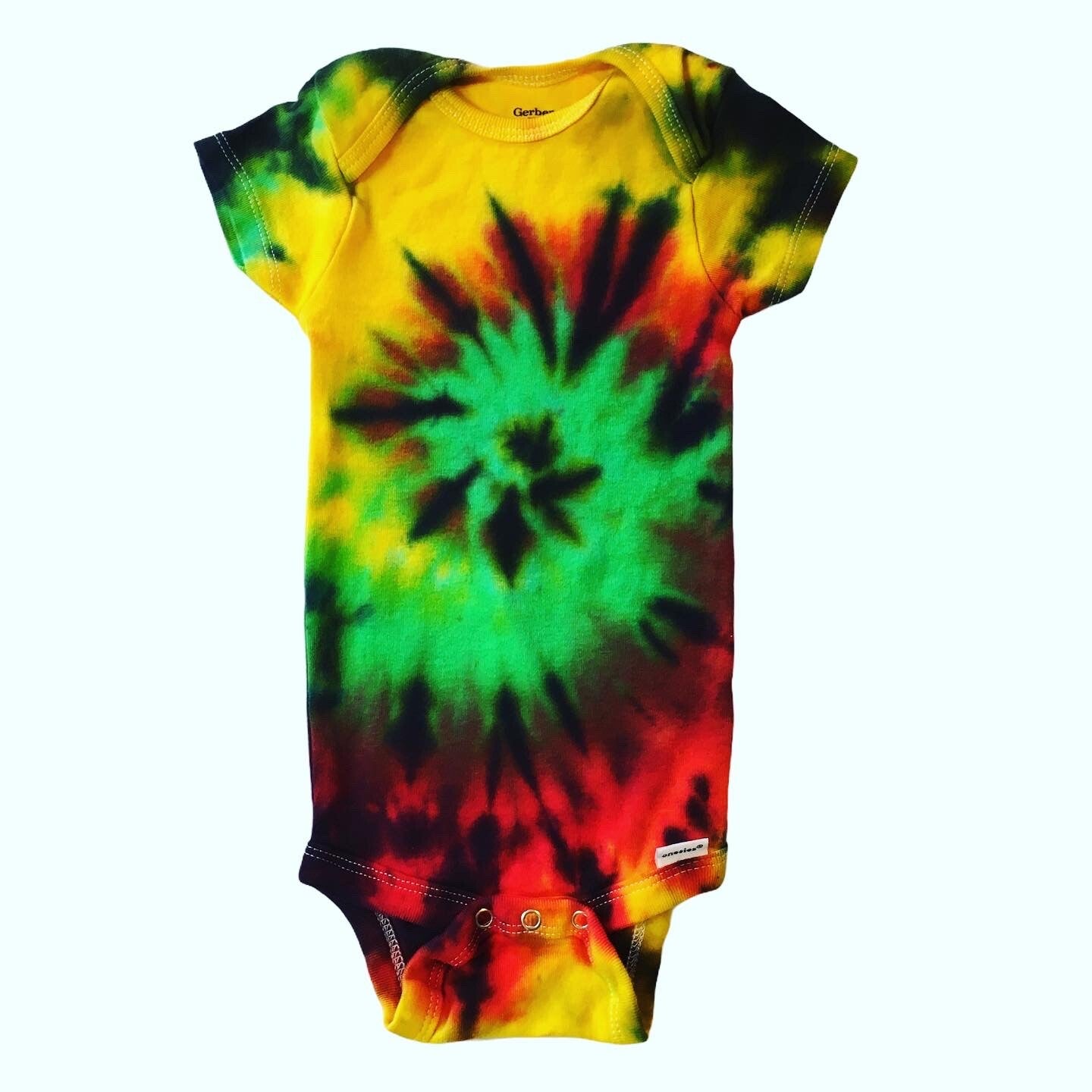 You will get the exact shirt pictured in the photo. Peace out with these one of a kind tees. Tie Dye baby onesie shirt in size 6-9 months. Comes in various colors and designs to choose from. Fiber reactive dye on 100% cotton Gerber brand organic baby onesie.