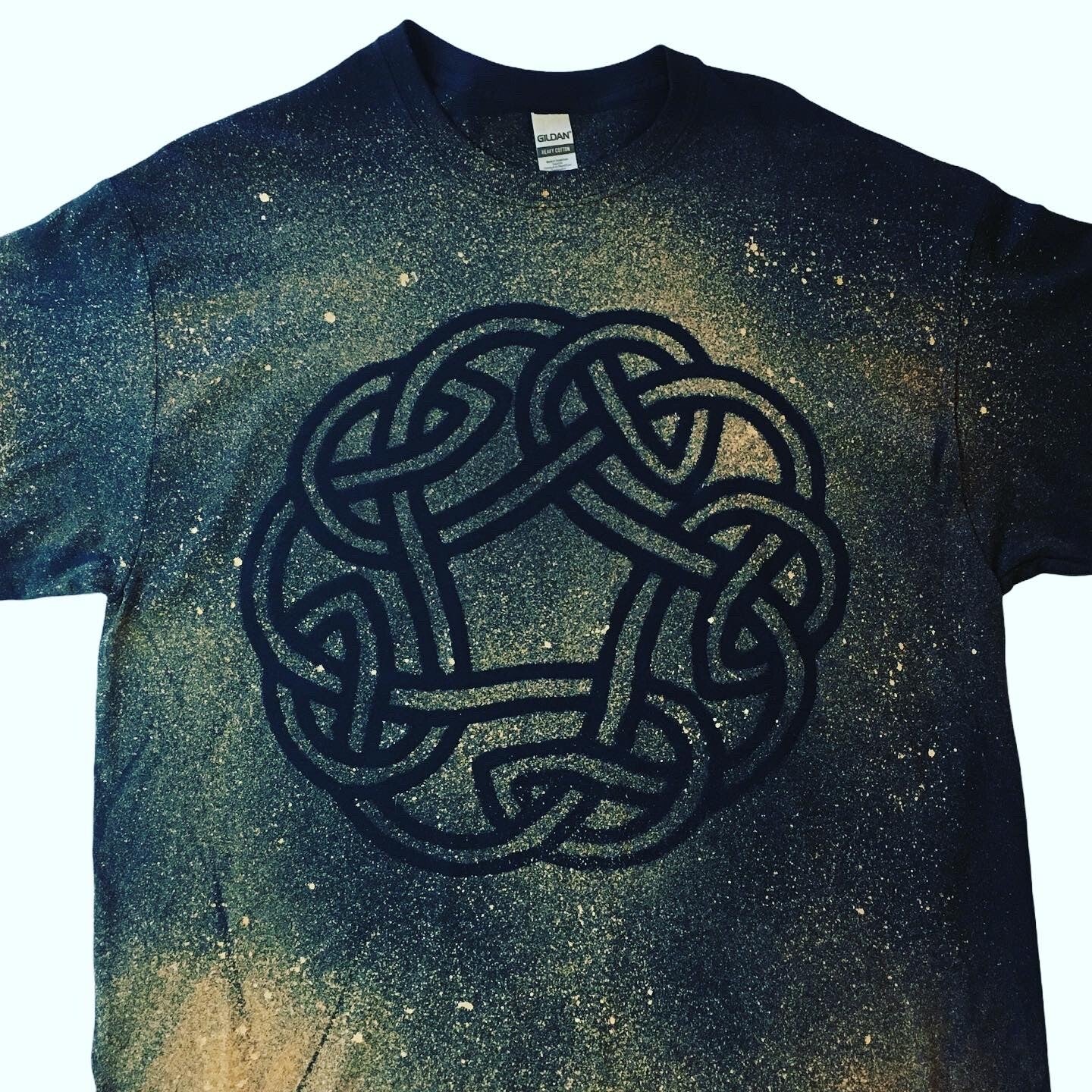 Black Bleach Spray T-Shirt is Machine Washable, 100% cotton and comes in sizes Small, Medium, Large and Extra Large. Each shirt features a celtic knot in a unique pattern. please be aware that every shirt is unique and no two shirts will ever be exactly the same.