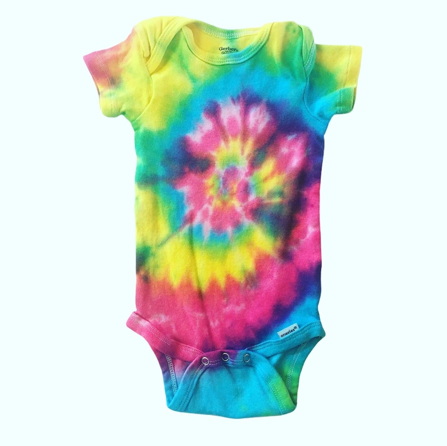 Peace out with these one of a kind tees. Tie Dye baby onesie shirt in size 3-6 months. Comes in various colors and designs to choose from. Hand Dyed shirts are similar but differ slightly from each other. Fiber reactive dye on 100% cotton Gerber brand organic baby onesie.