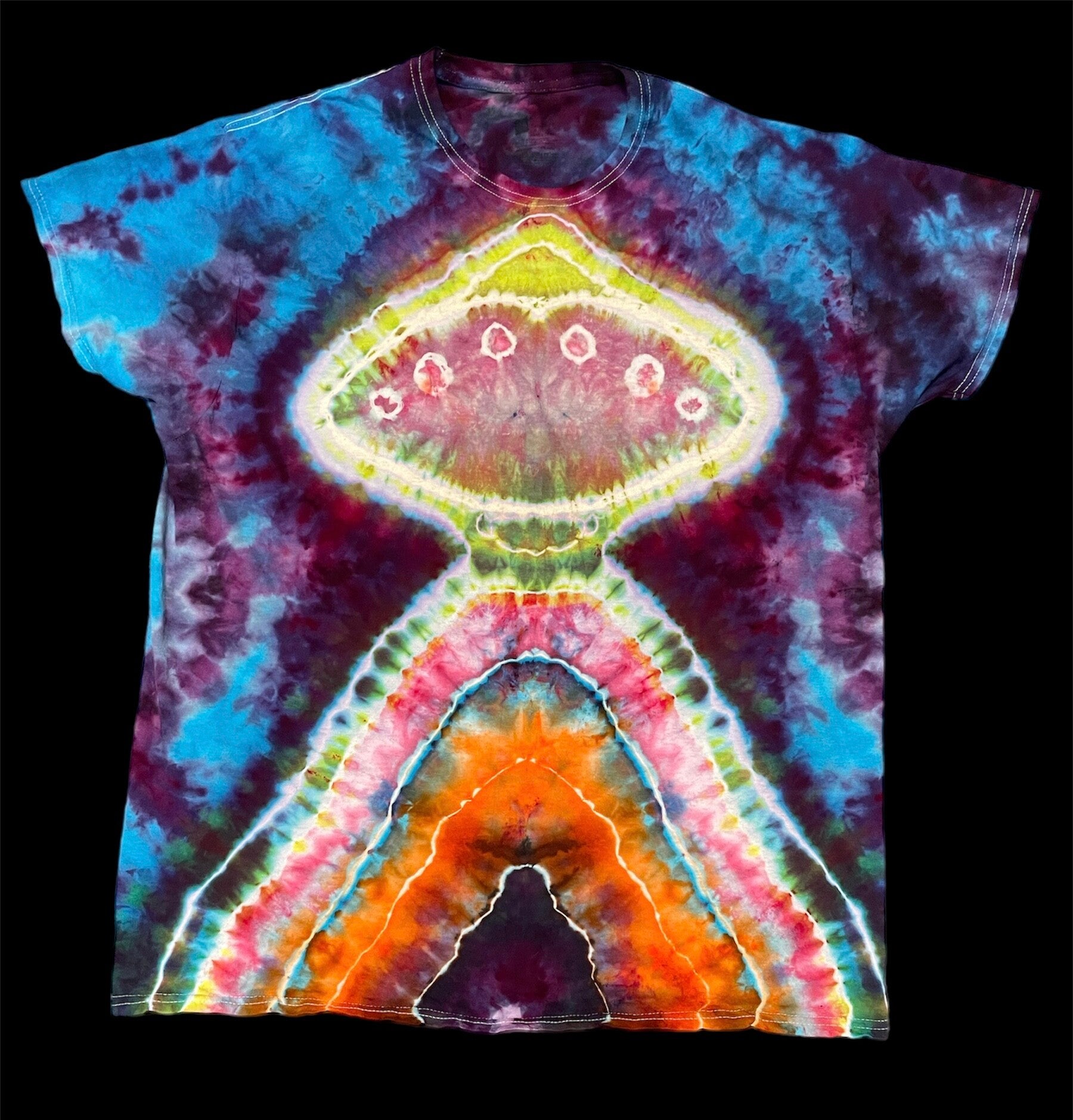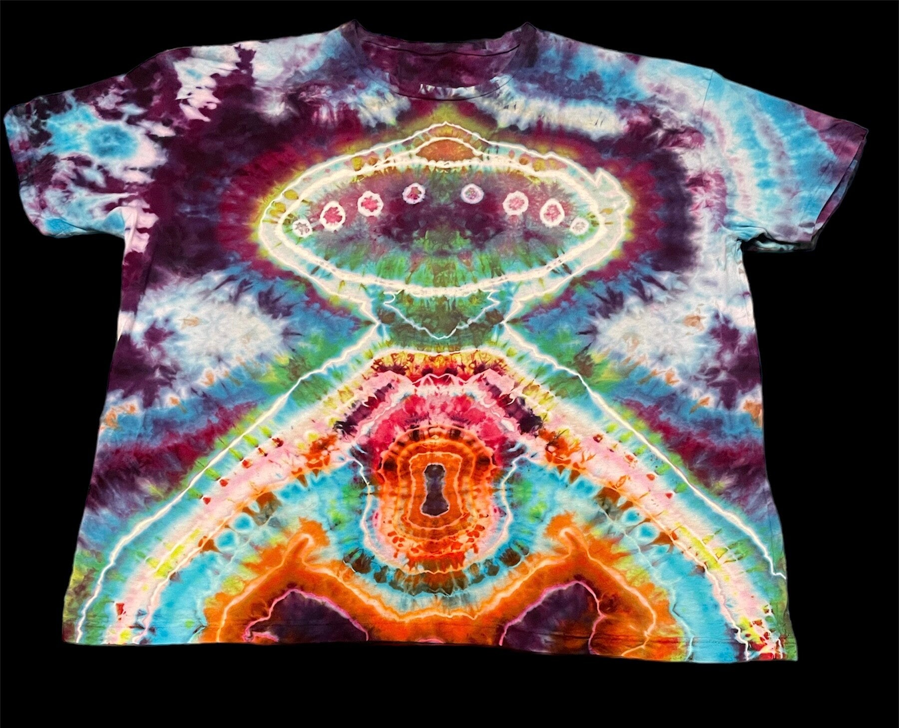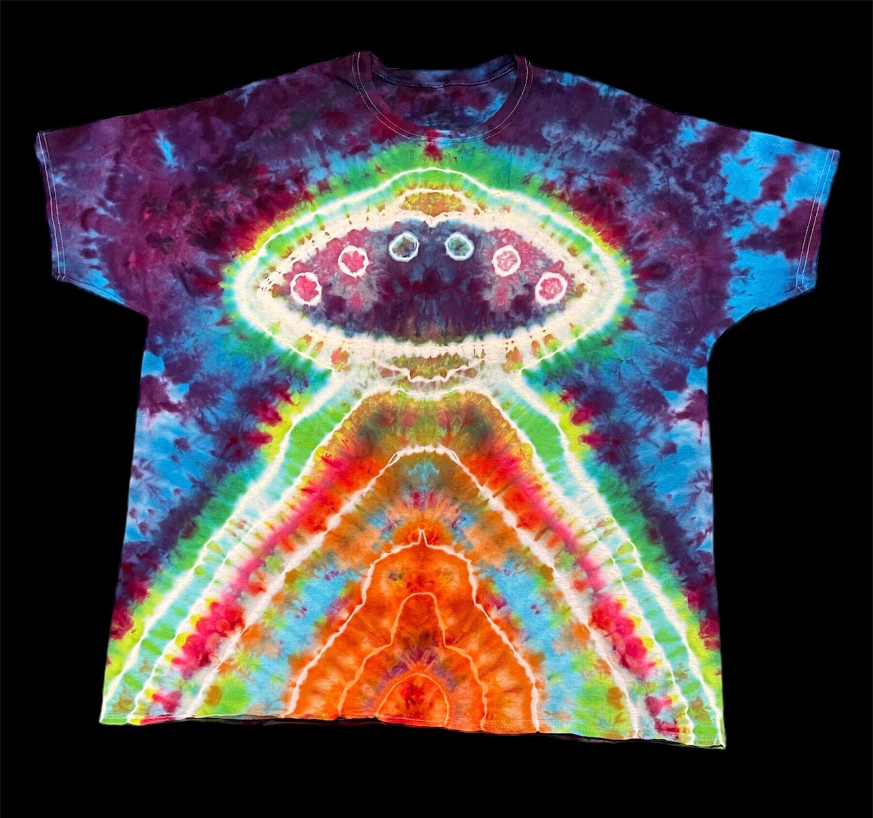 Peace out with these one of a kind tees featuring a UFO Ubduction. Tie Dye Adult T-shirt comes in size Small, Medium, Large, XLarge, 2XL, 3XL. Hand dyed shirts are similar but differ slightly from each other. Fiber reactive dye on 100% cotton Gildan brand shirts.