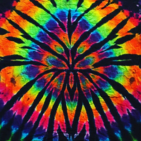 Peace out with these one of a kind bandanas featuring Rainbow colors with black. Measures 2' X 2'. Hand dyed bandanas are similar but differ slightly from each other. Can be used as a tapestry, flag or neckscarf. Fiber reactive dye on 100% cotton.