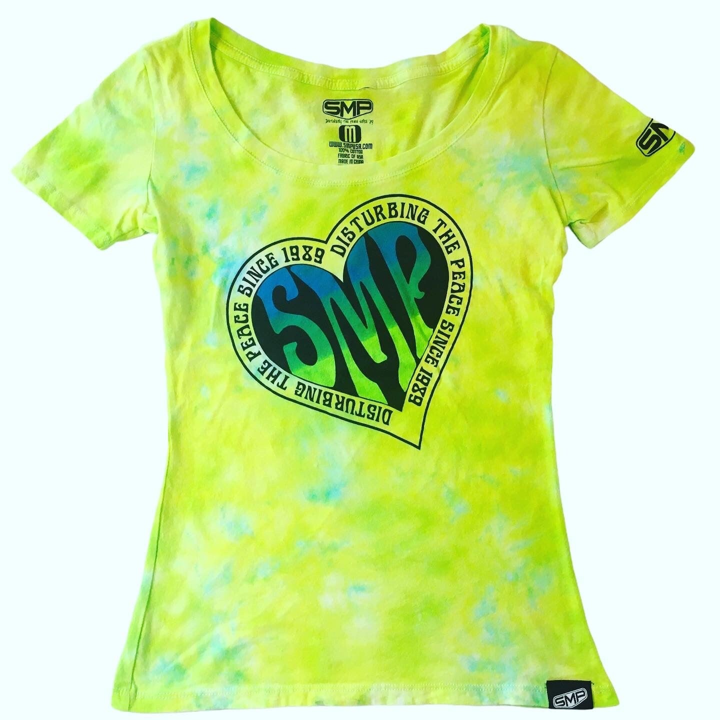 Peace out with these one of a kind tees. Tie Dye Women's T-shirt comes in sizes Small, Medium and XLarge. Hand dyed shirts are similar but differ slightly from each other. Fiber reactive dye on 100% cotton shirts.