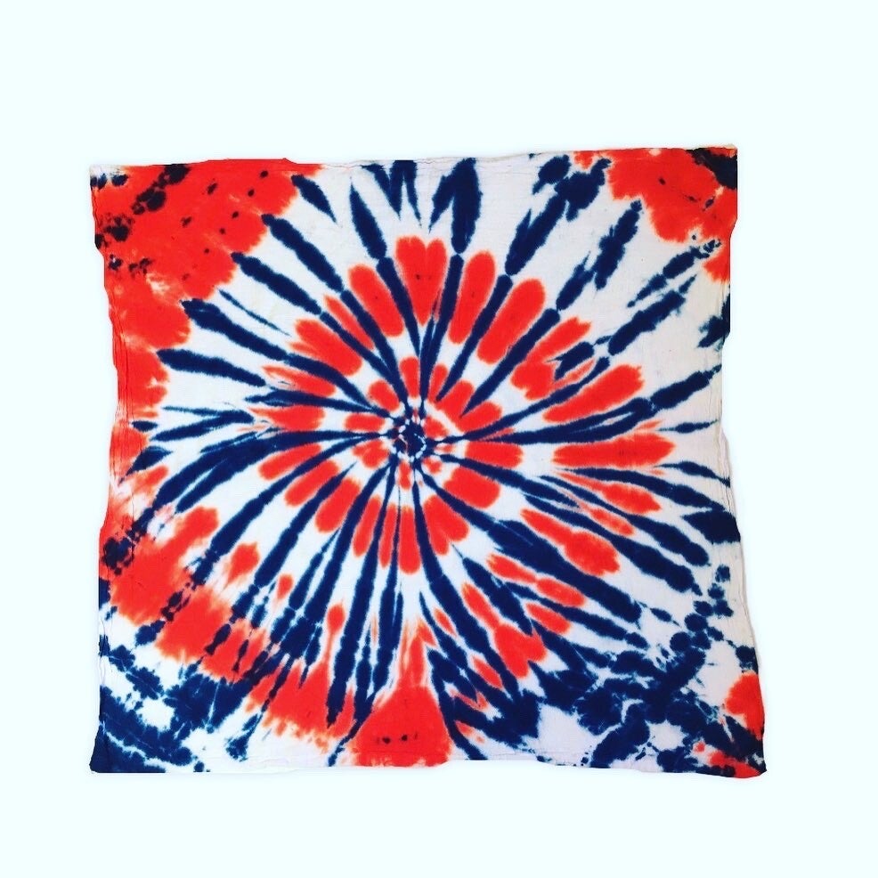 Peace out with these one of a kind bandanas featuring a USA swirl pattern. Measures 2' X 2'. Hand dyed bandanas are similar but differ slightly from each other. Can be used as a tapestry, flag or neckscarf. Fiber reactive dye on 100% cotton.