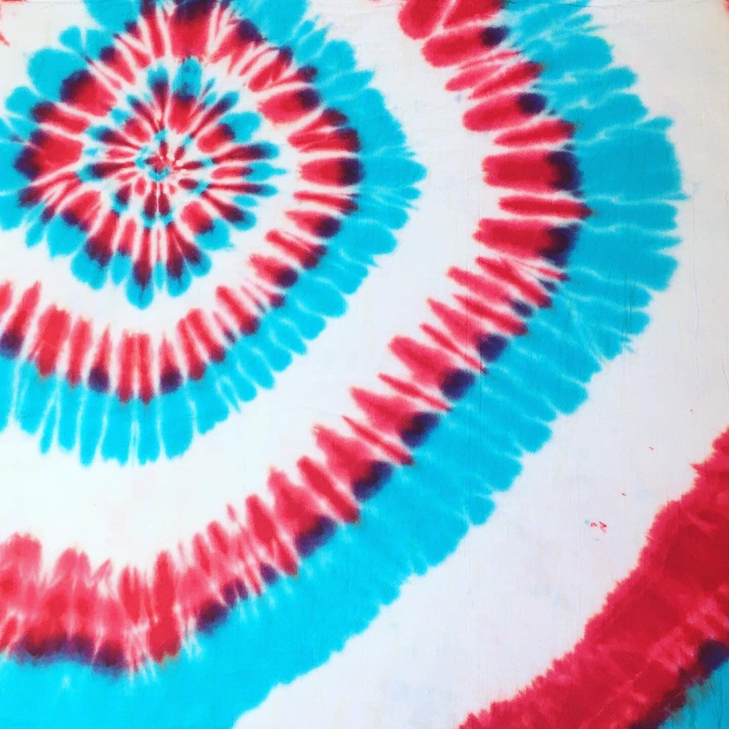 Peace out with these one of a kind bandanas featuring red white and blue colors. Measures 2' X 2'. Hand dyed bandanas are similar but differ slightly from each other. Can be used as a tapestry, flag or neckscarf. Fiber reactive dye on 100% cotton.