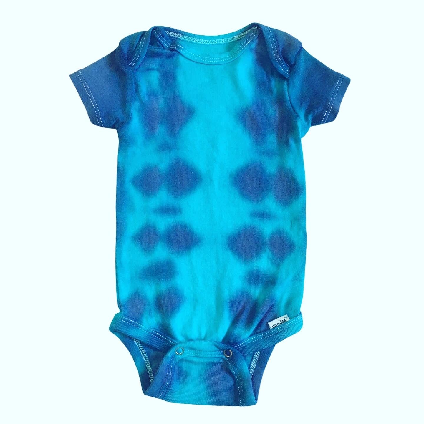 You will get the exact shirt pictured in the photo. Peace out with these one of a kind tees. Tie Dye baby onesie shirt in size 0-3 months. Comes in various colors and designs to choose from. Fiber reactive dye on 100% cotton Gerber brand organic baby onesie.