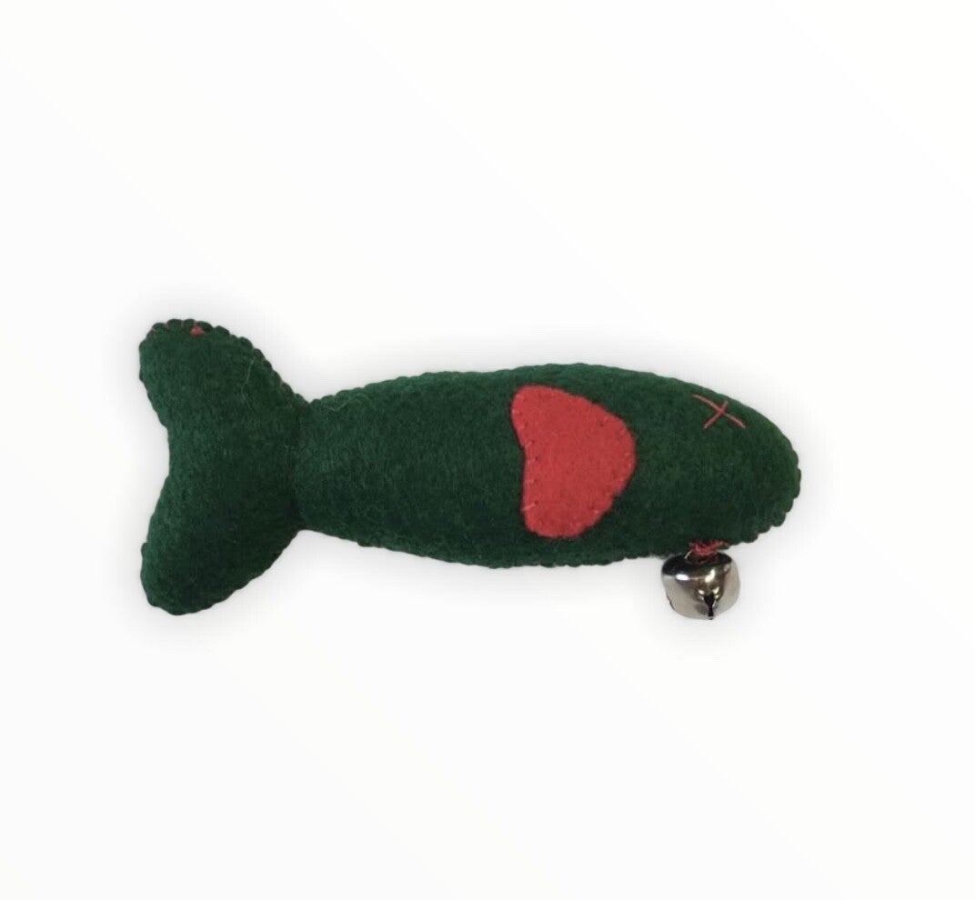 Your cat will Peace out with these fun cat toys in the shape of a fish. This fun toy is sure to delight. Each is made from felt material and has a jingle bell for added sound. Stuffed with fiber fill fluff. Approximately 5" long (Cat nip not included)