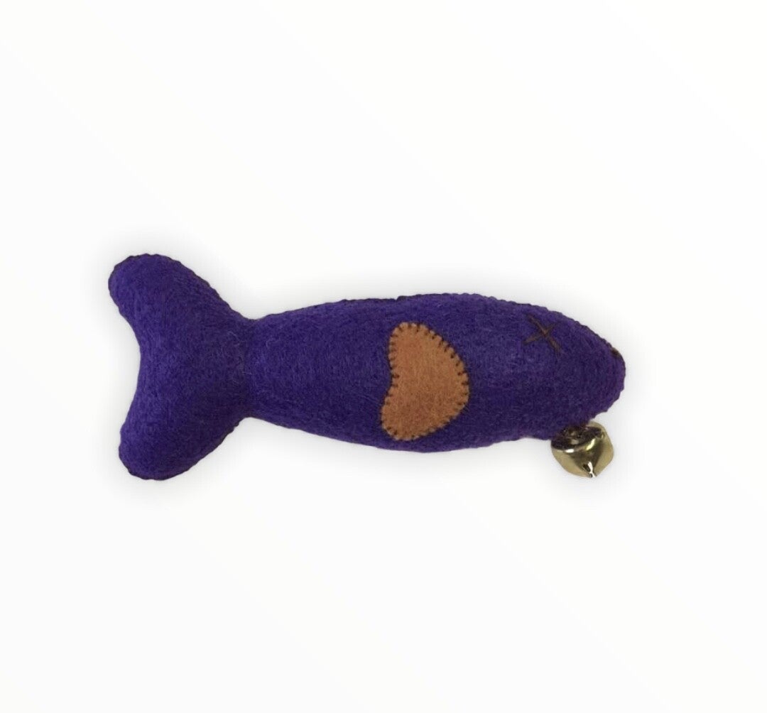 Your cat will Peace out with these fun cat toys in the shape of a fish. This fun toy is sure to delight. Each is made from felt material and has a jingle bell for added sound. Stuffed with fiber fill fluff. Approximately 5" long (Cat nip not included)