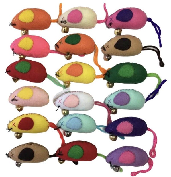 Your cat will Peace out with these fun cat toys in the shape of a mouse. This fun toy is sure to delight. Each is made from felt material and has a jingle bell for added sound. Stuffed with fiber fill fluff. Approximately 4"long (Cat nip not included)