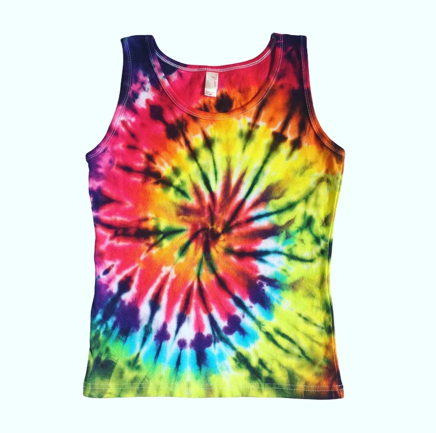 Peace out with these one of a kind Tanks. Tie Dye Tanks comes in Size Women's Medium and Large. Hand dyed tanks are similar but differ slightly from each other. Fiber reactive dye on 100% cotton Tanks.