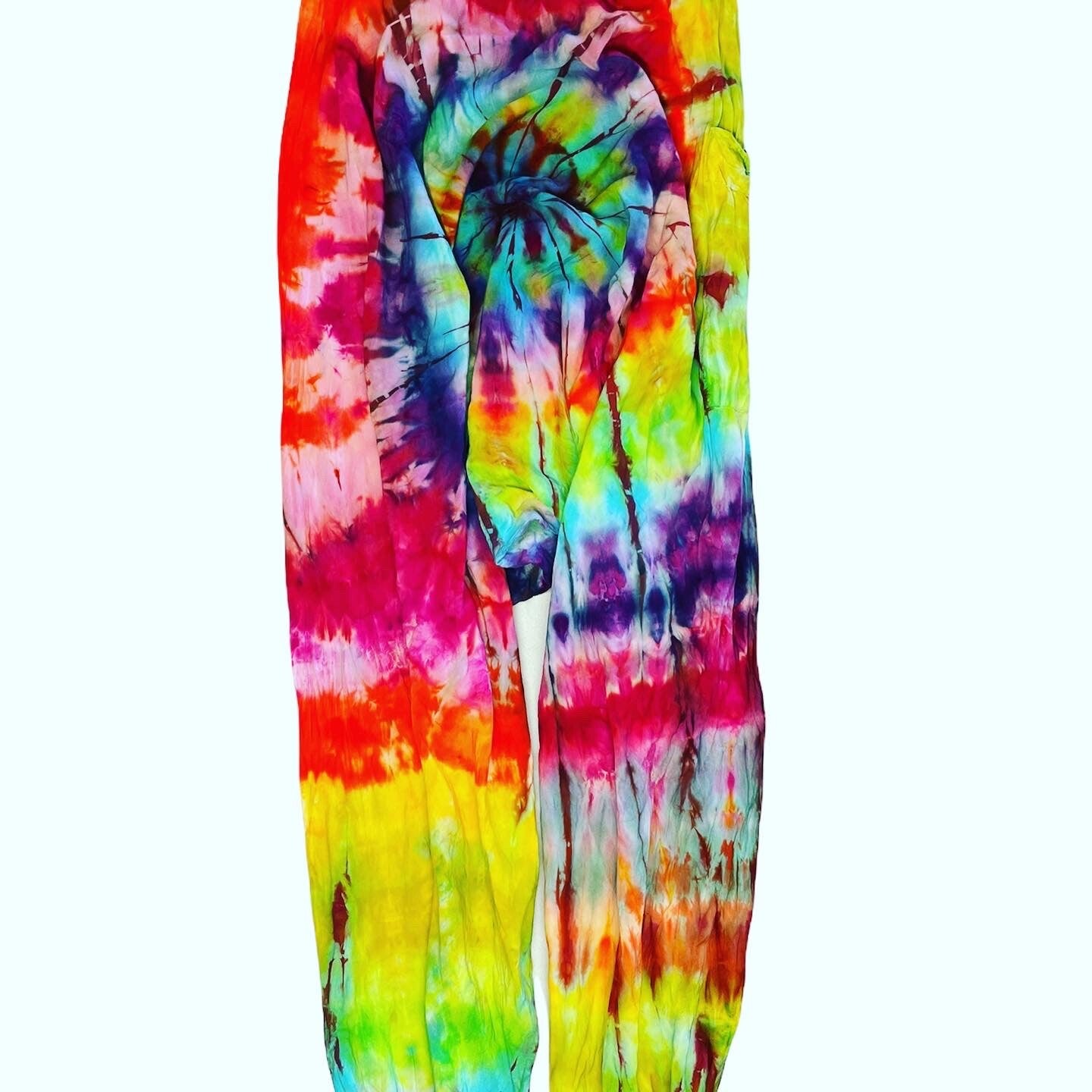Peace out with these one of a kind sets for Festival fun and more. Made to be warn loose and baggy, these Tie Ice Dye women's Adult Harem pants and matching Crop Top sets come in size Small, Medium, Large and XLarge. Hand dyed pants and tops are similar but differ slightly from each other. Fiber reactive dye on 100% cotton Tops and 100% Rayon bottoms. Wash Rayon products on delicate cycle with cold water. Hang to dry.