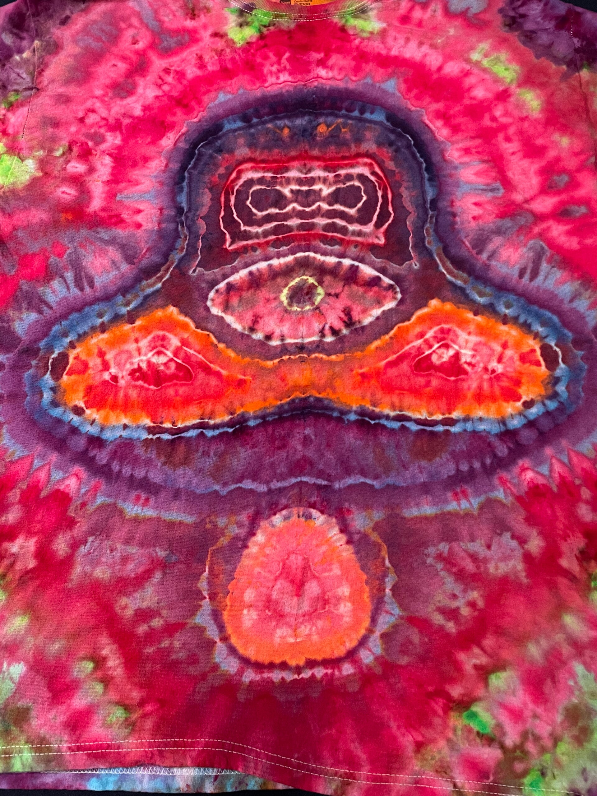 Peace out with these one of a kind tees featuring a Mushroom. Tie Dye Adult T-shirt comes in size 2XL. Hand dyed shirts are similar but differ slightly from each other. Fiber reactive dye on 100% cotton Gildan brand shirts.