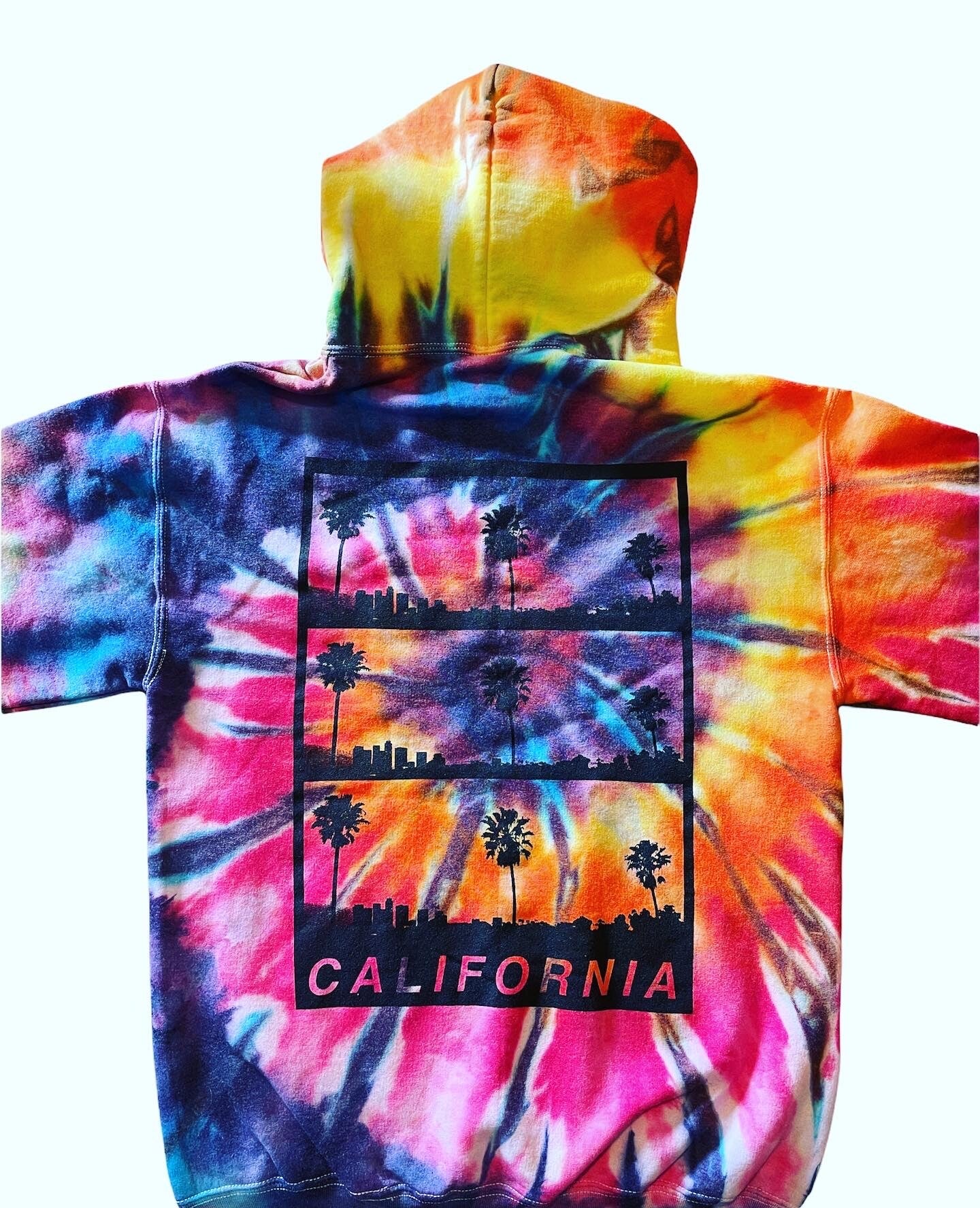 Peace out with this one of a kind hoodie featuring California Palm Trees and Sunset Colors. Comes in Adult size Small. Hand dyed hoodies are similar but differ slightly from each other. Fiber reactive dye on 50% cotton 50% polyester Gildan brand hoodies.