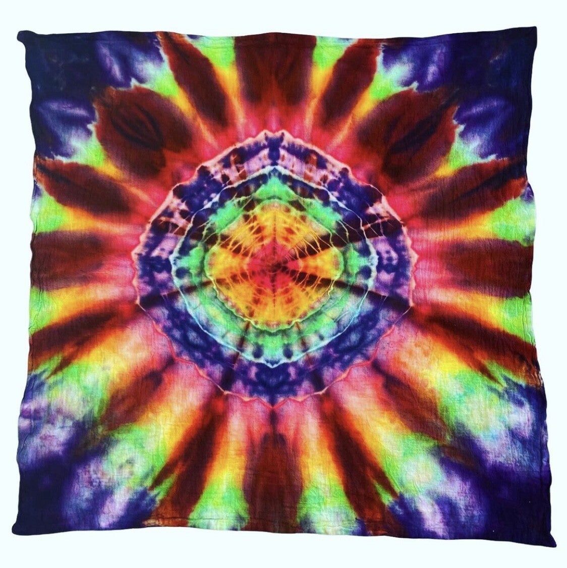 Peace out with these one of a kind bandanas featuring a Rainbow Mandala. Measures 2' X 2'. Hand dyed bandanas are similar but differ slightly from each other. Can be used as a tapestry, flag or neckscarf. Fiber reactive dye on 100% cotton.