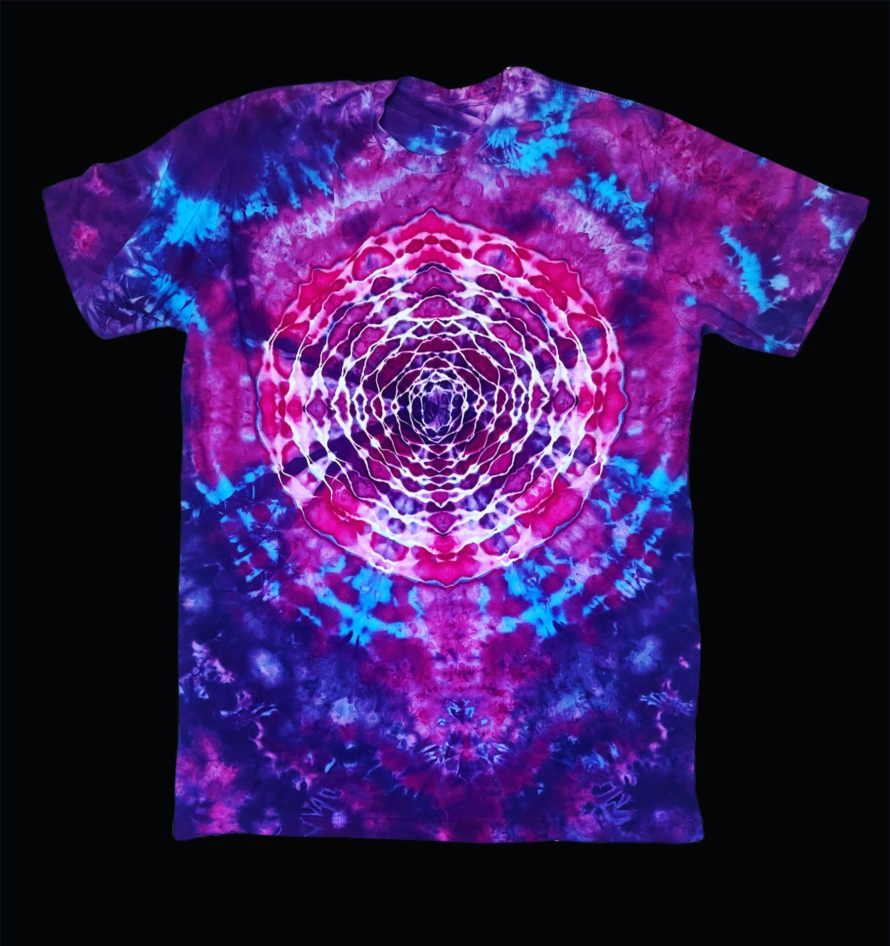 Peace out with these one of a kind tees. Tie Ice Dye Adult T-shirt comes in size 3XL. Hand dyed shirts are similar but differ slightly from each other. Fiber reactive dye on 100% cotton Gildan brand shirts.