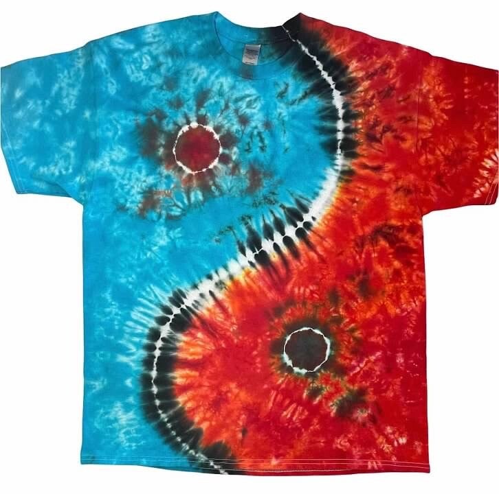 Peace out with these one of a kind tees featuring a Yin Yang design. Tie Dye Adult T-shirt comes in size Small, Medium, Large, XLarge, 2XL, 3XL, 4XL and 5XL. Hand dyed shirts are similar but differ slightly from each other. Fiber reactive dye on 100% cotton Gildan brand shirts.