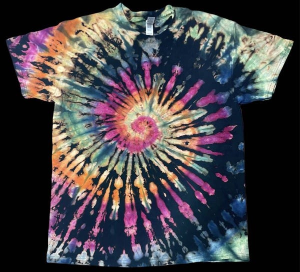 Peace out with these one of a kind tees. Reverse Ice Dye Adult T-shirt comes in size Small, Medium, Large and XLarge. Hand dyed shirts are similar but differ slightly from each other. Bleach Mixture and Fiber reactive dye on 100% cotton Gildan brand black shirts.