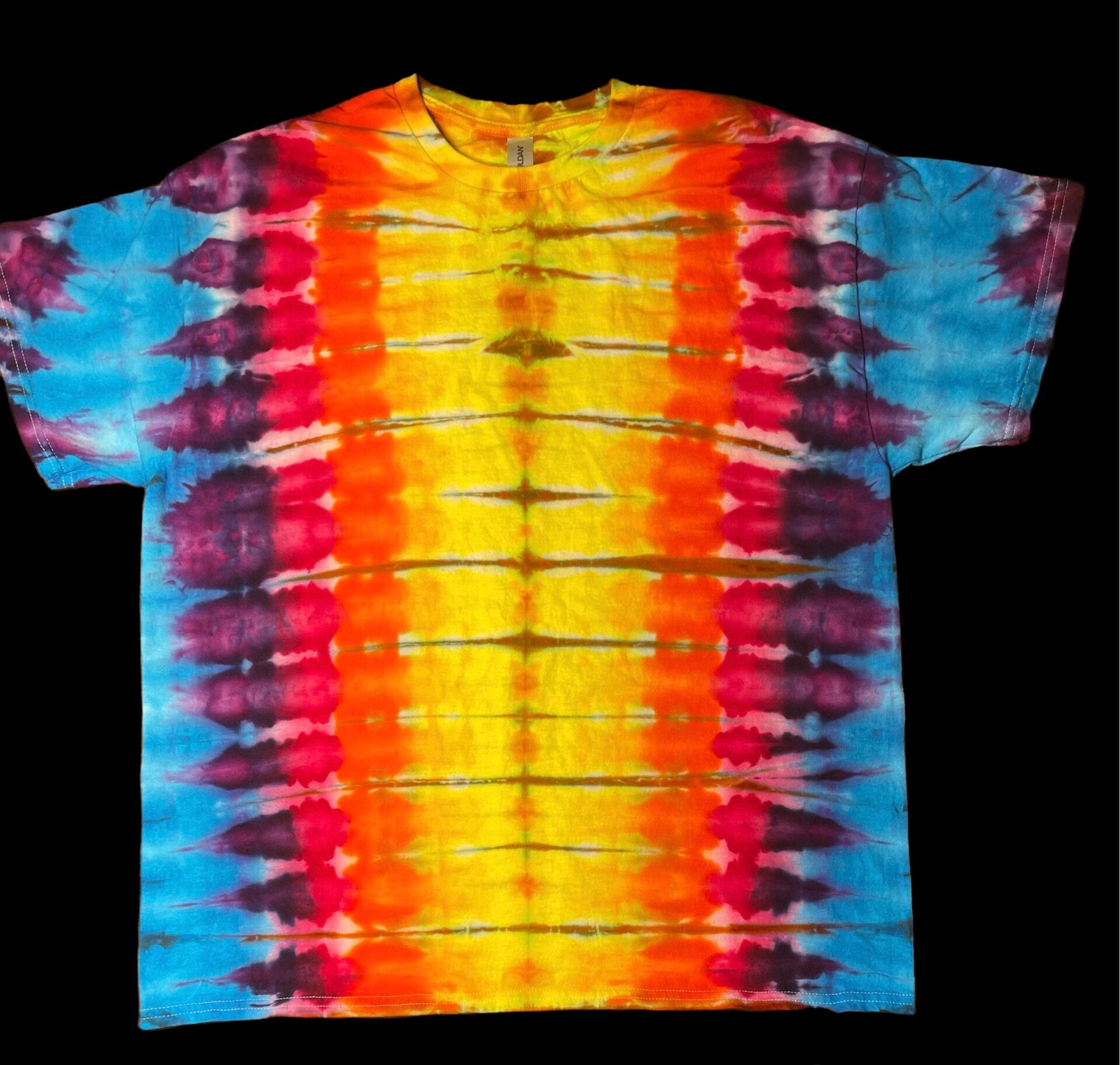 Peace out with these one of a kind tees. Tie Ice Dye Adult T-shirt comes in size Small, Medium, Large, XLarge, 2XL, 3XL, 4XL and 5XL. Hand dyed shirts are similar but differ slightly from each other. Fiber reactive dye on 100% cotton Gildan brand shirts.