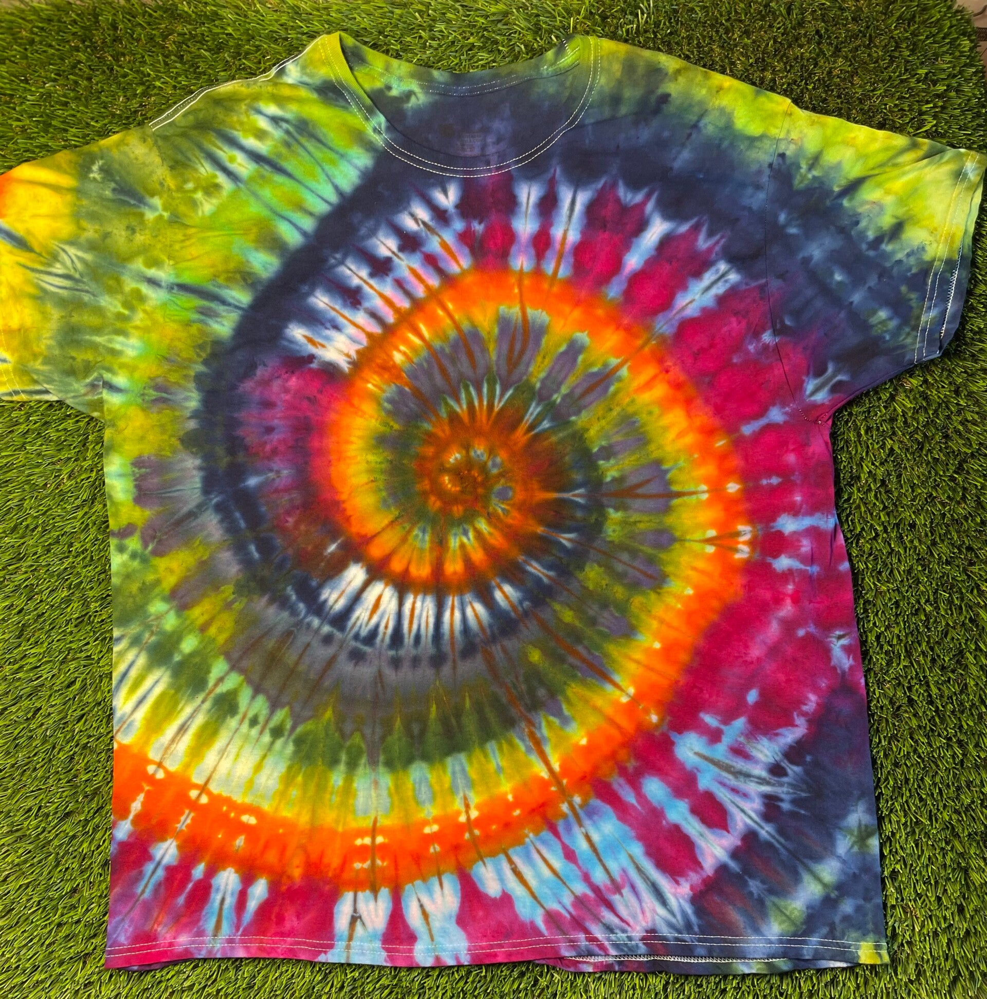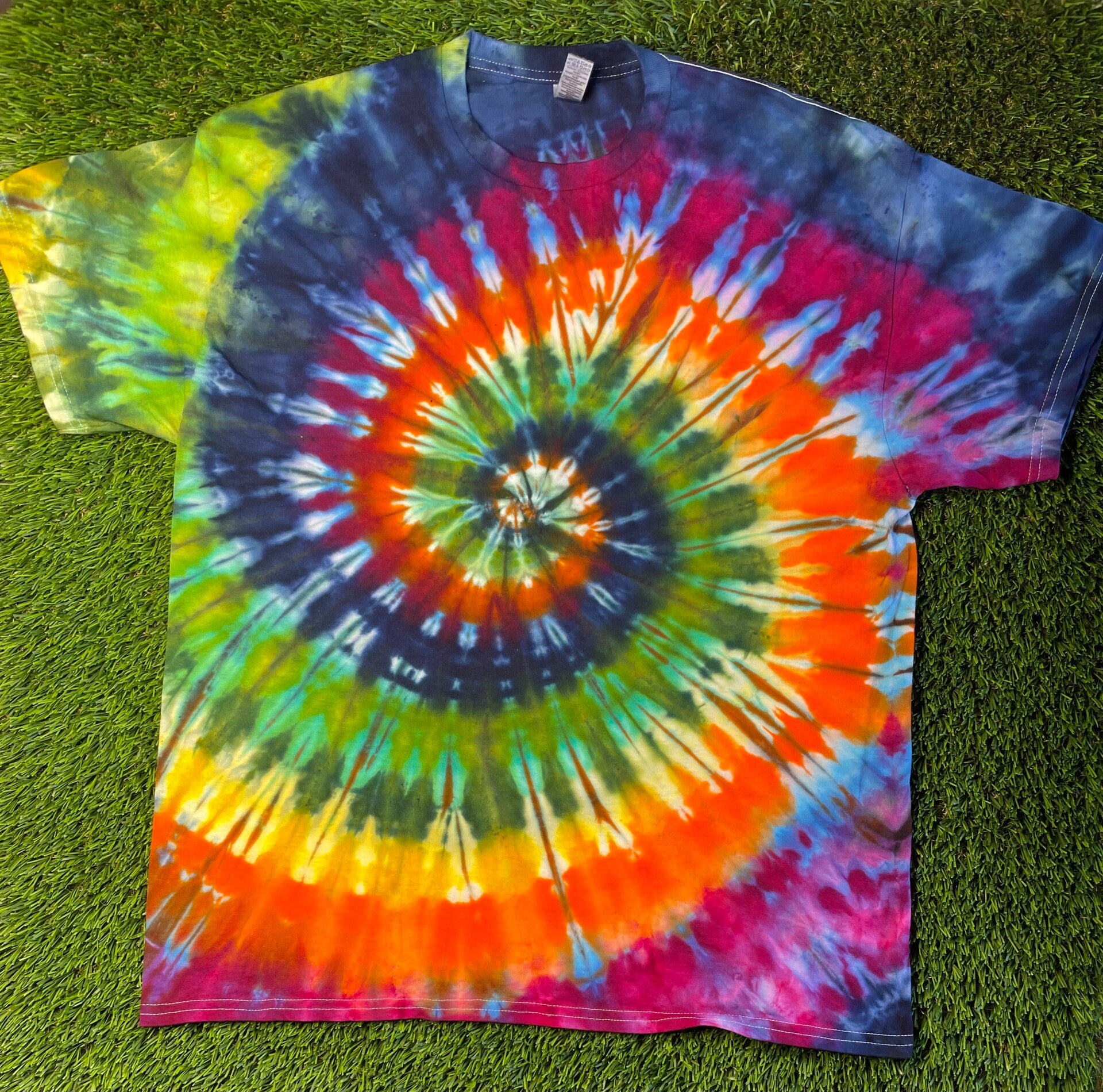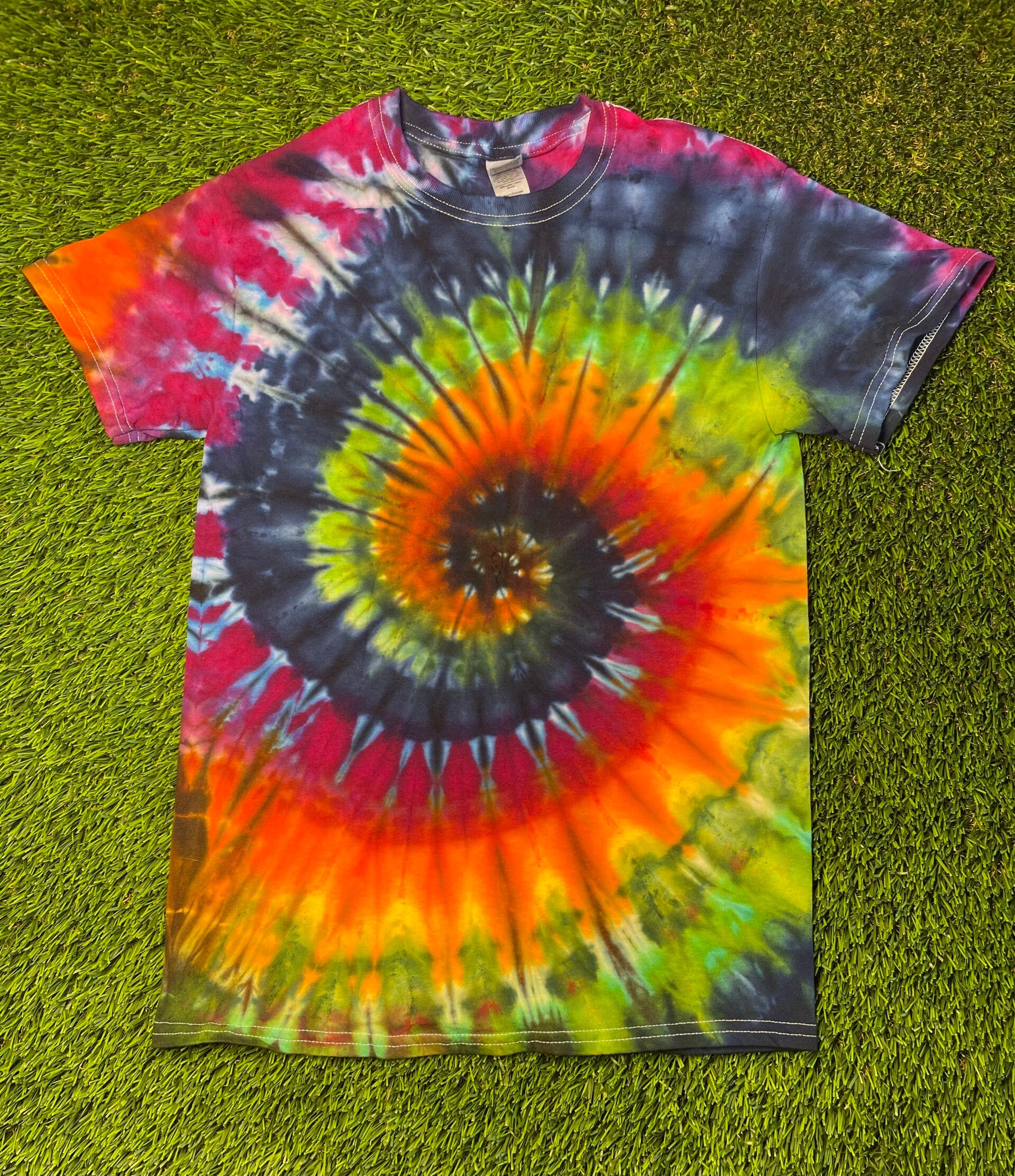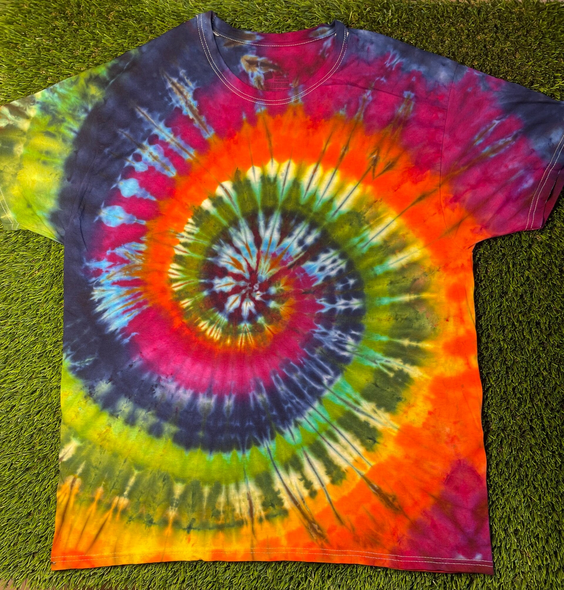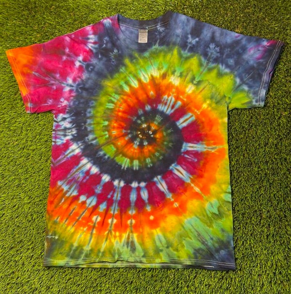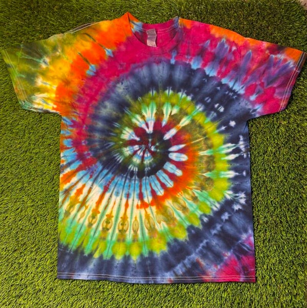 Peace out with these one of a kind tees. Tie Ice Dye Adult T-shirt comes in size Small, Medium, Large, XLarge, 2XL, 3XL.  Hand dyed shirts are similar but differ slightly from each other. Fiber reactive dye on 100% cotton Gildan brand shirts.