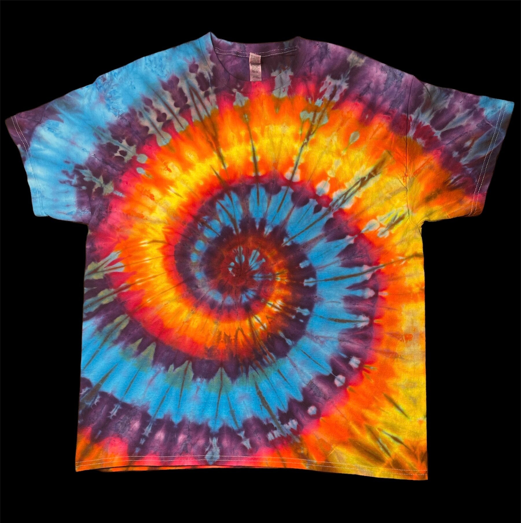 Peace out with these one of a kind tees. Tie Ice Dye Adult T-shirt comes in size Small, Medium, Large, XLarge, 2XL, 3XL. Hand dyed shirts are similar but differ slightly from each other. Fiber reactive dye on 100% cotton Gildan and Hanes brand shirts.