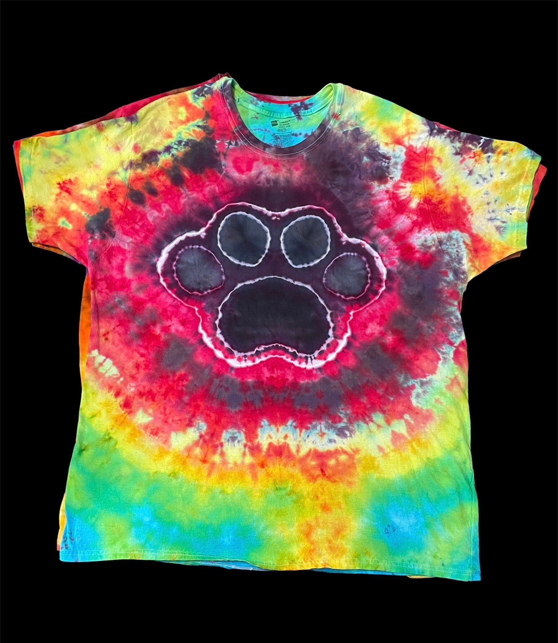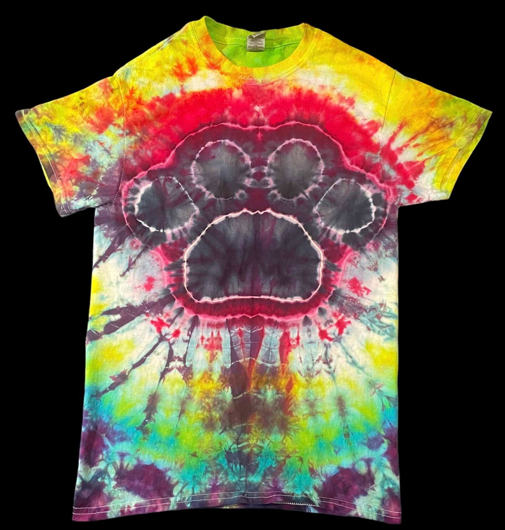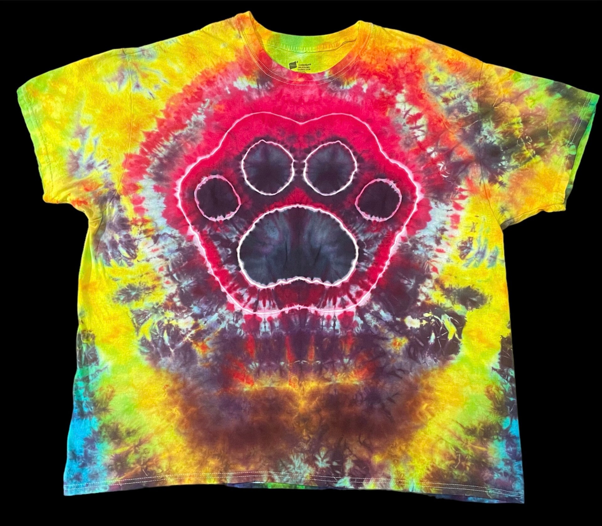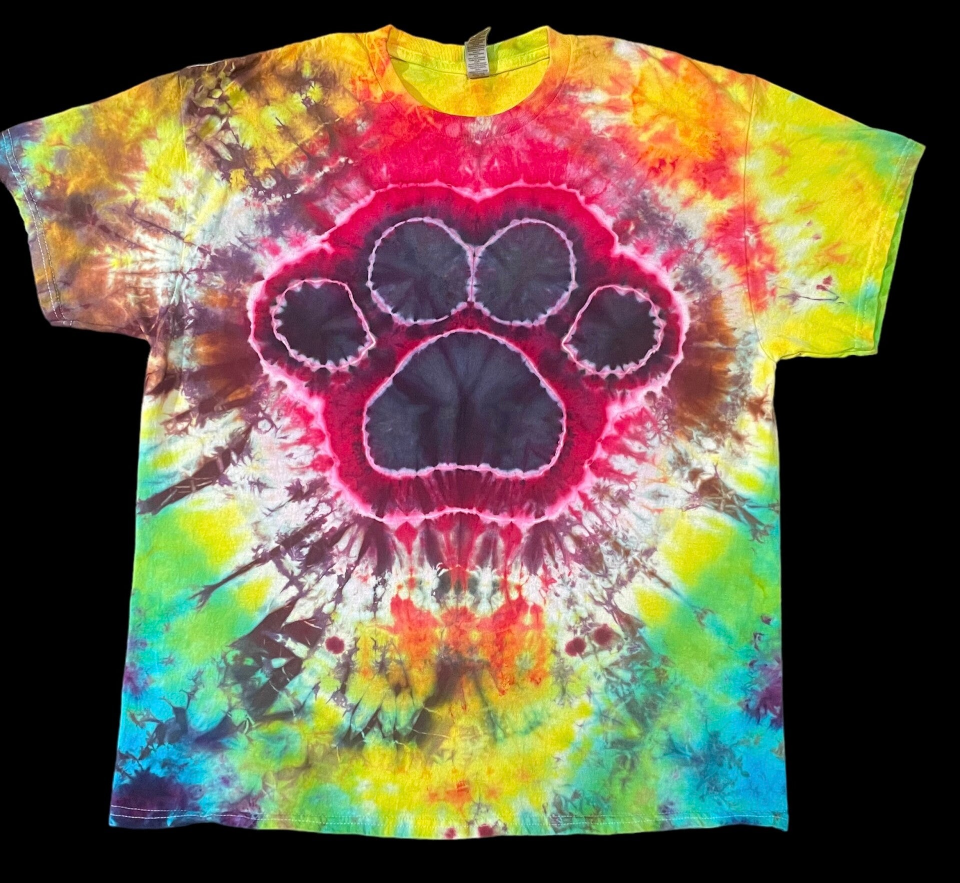 Peace out with these one of a kind tees featuring a Puppy Paw. Tie Dye Adult T-shirt comes in size Small, Medium, Large, XLarge, 2XL and 3XL. Hand dyed shirts are similar but differ slightly from each other. Fiber reactive dye on 100% cotton Gildan brand shirts.