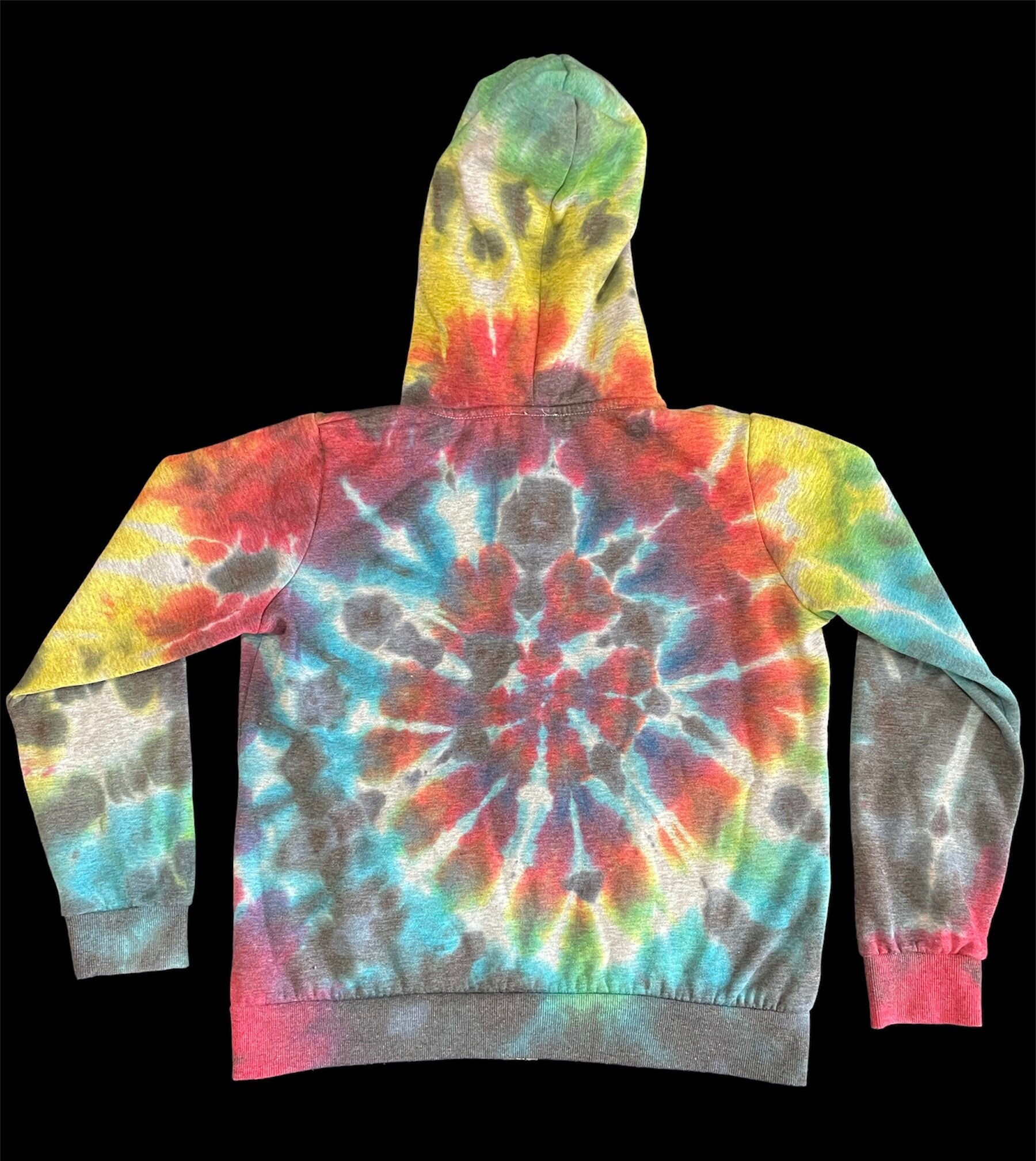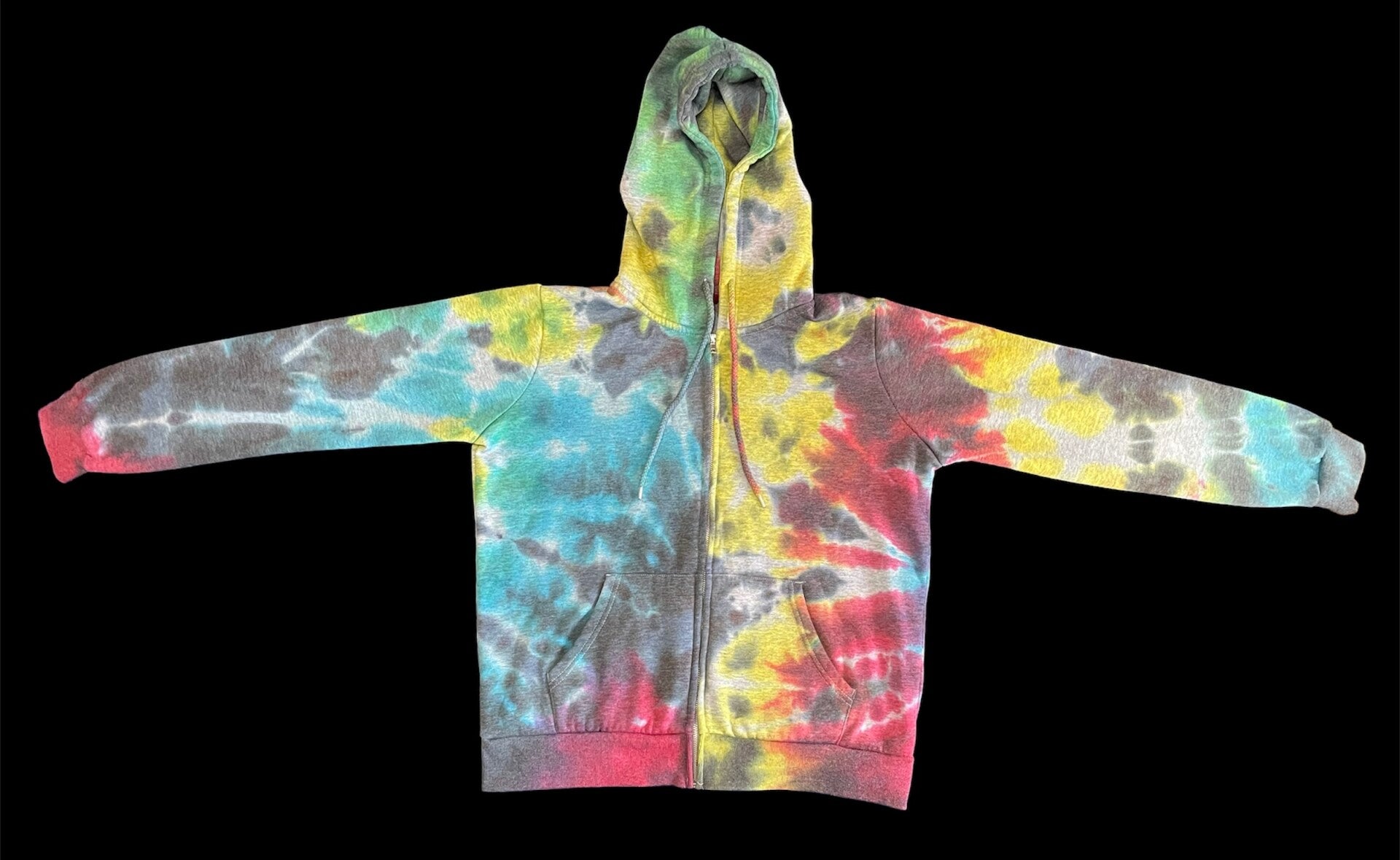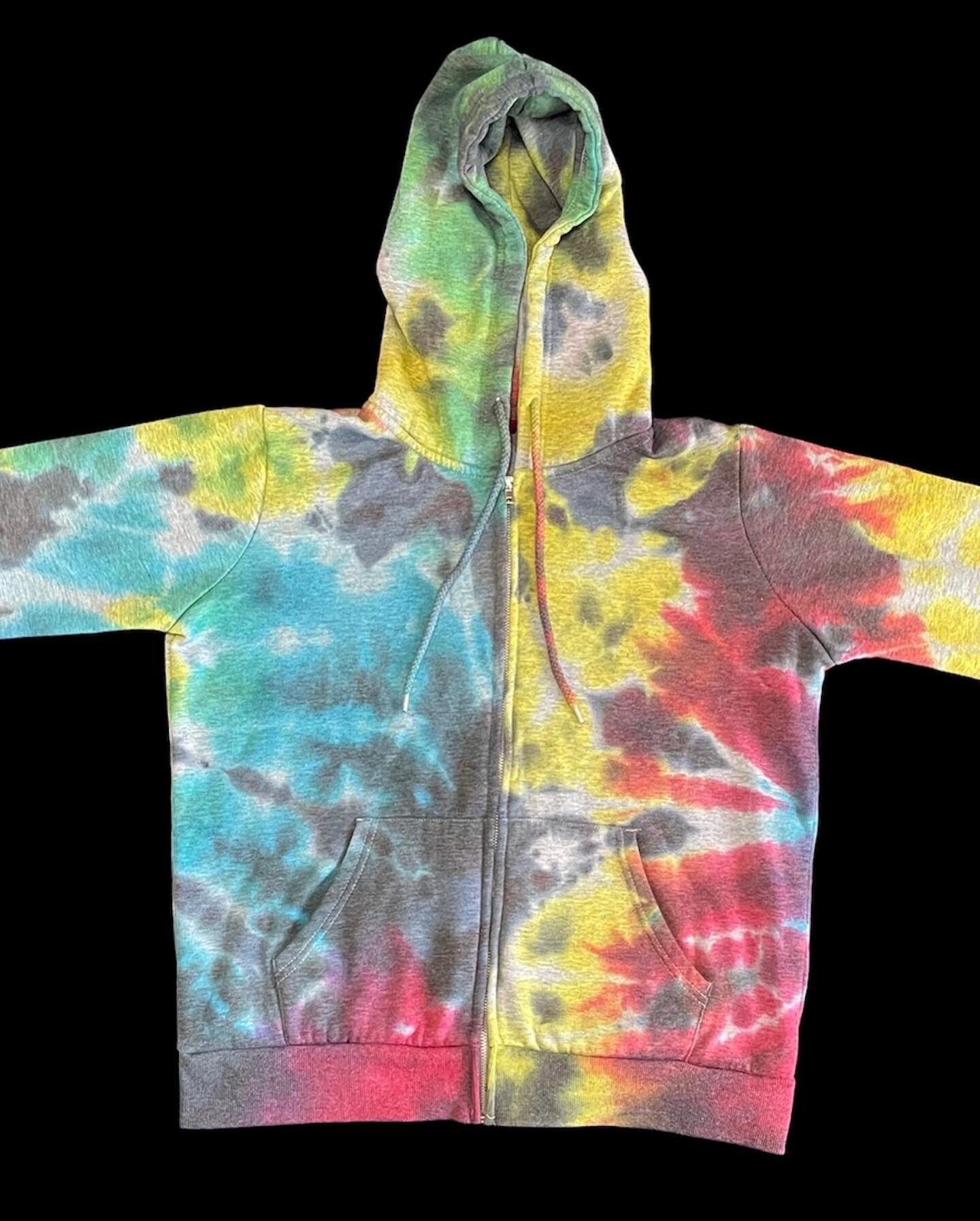 Peace out with these one of a kind zip hoodies featuring rainbow swirl. Tie Dye Adult Hoodie comes in size Small, Medium, Large, XLarge. Hand dyed hoodies are similar but differ slightly from each other. Fiber reactive dye on 60% cotton 40%polyester.